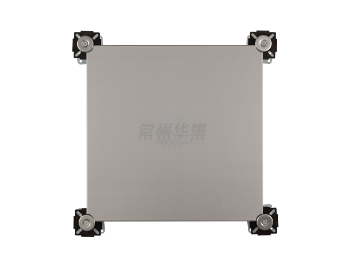 中心采用高強度硫酸鈣為基材,上下采用優(yōu)質(zhì)鍍鋅鋼板包覆并延伸至四周側面,通過掛鉤連接形式,經(jīng)沖壓,鉚接形成封閉環(huán)!四周采用六面鉚接優(yōu)質(zhì)鍍鋅板,四角帶/不帶角鎖孔,表面可鋪設地毯、pvc或其他材料;支架模壓成型,上托帶塑膠墊,完成面高度為70-150mm,可采用橫梁四周支撐式結構或支架四角支撐式結構。